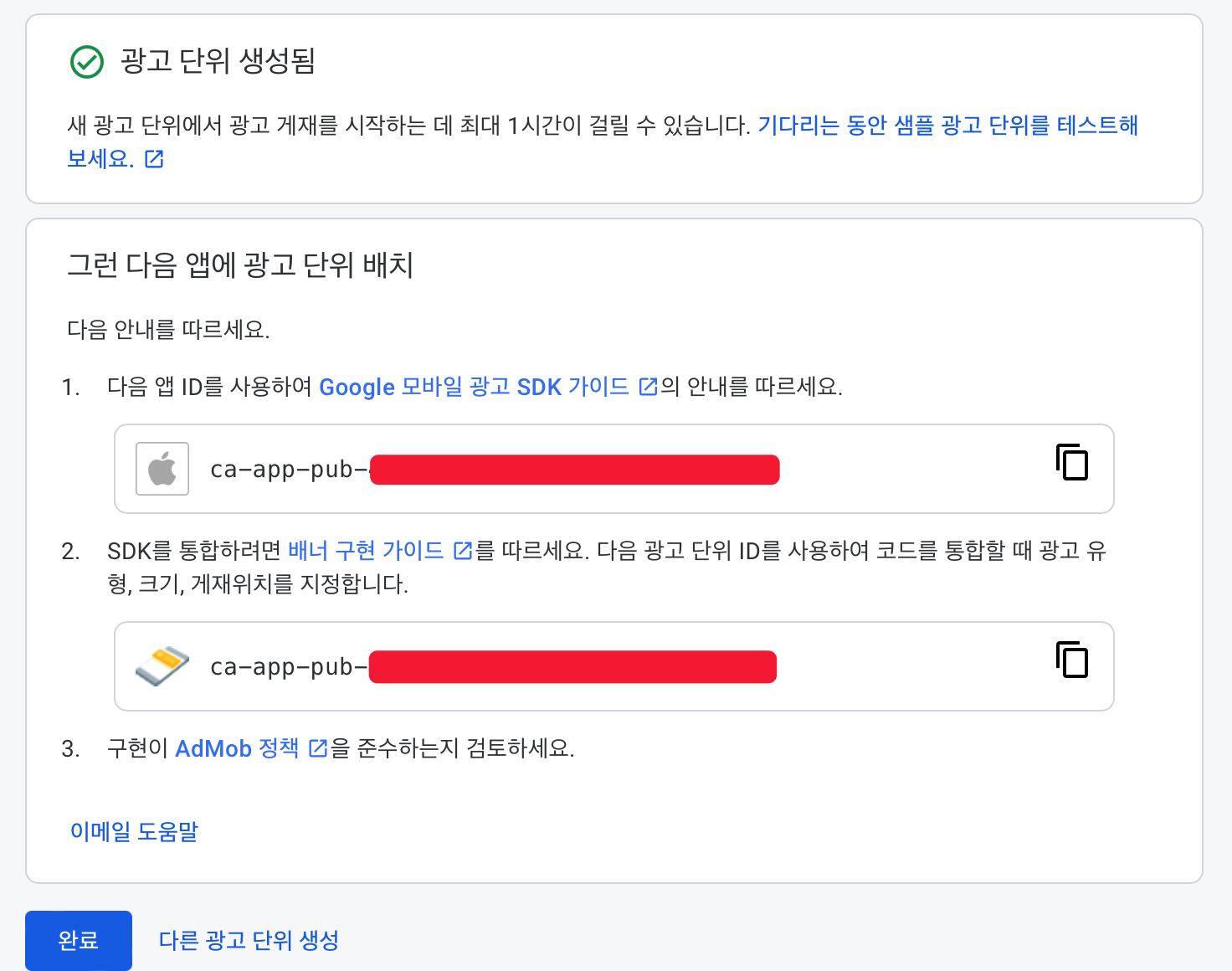 - 아래 같은 화면에서 [앱 ID], [단위ID]가 나중에 필요하니 메모해둡니다.