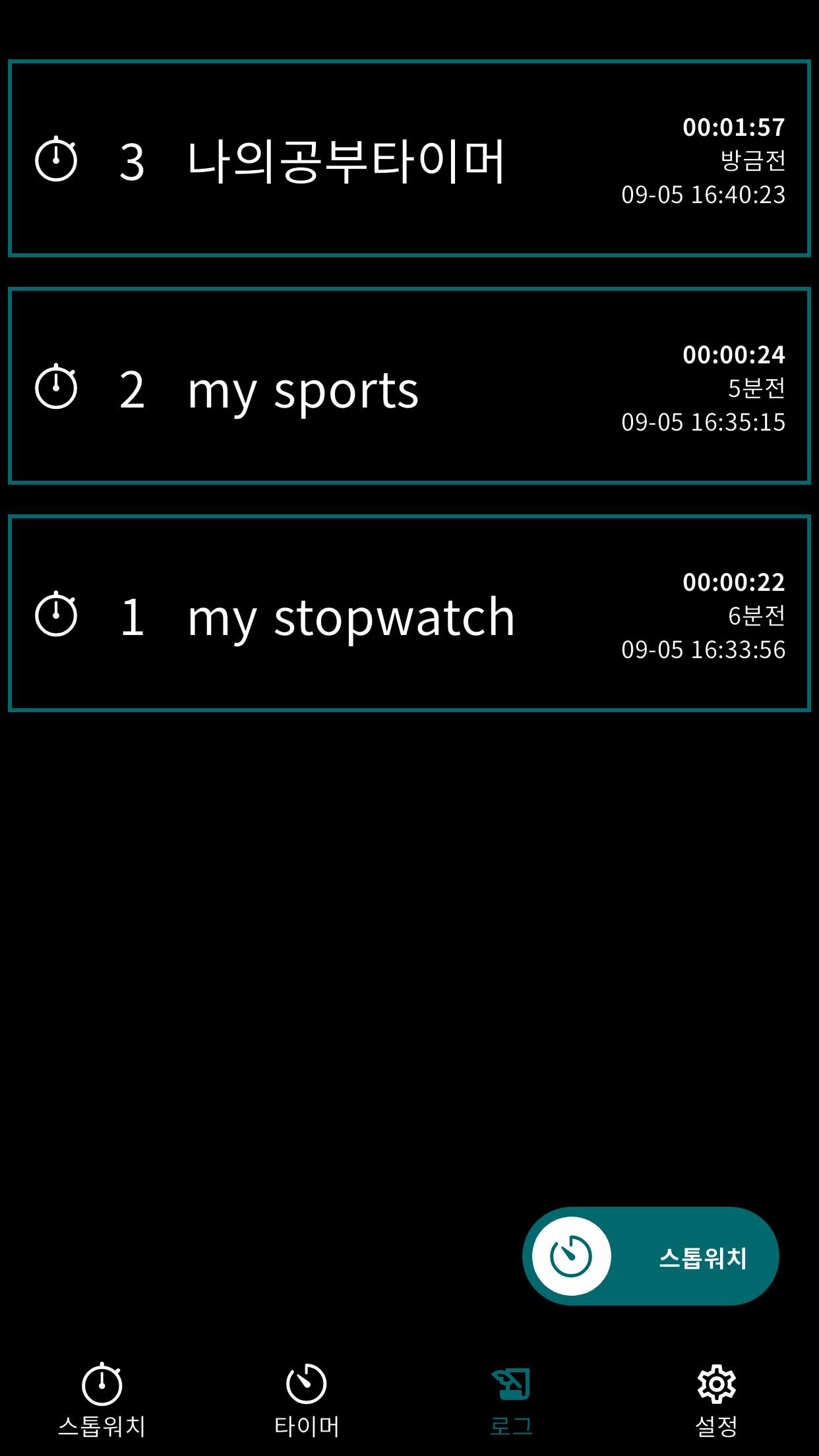 - 스톱워치는 초기화시 로그의 스톱워치 탭에 저장되며, 로그를 클릭하여 해당 스톱워치를 불러올 수 있습니다.