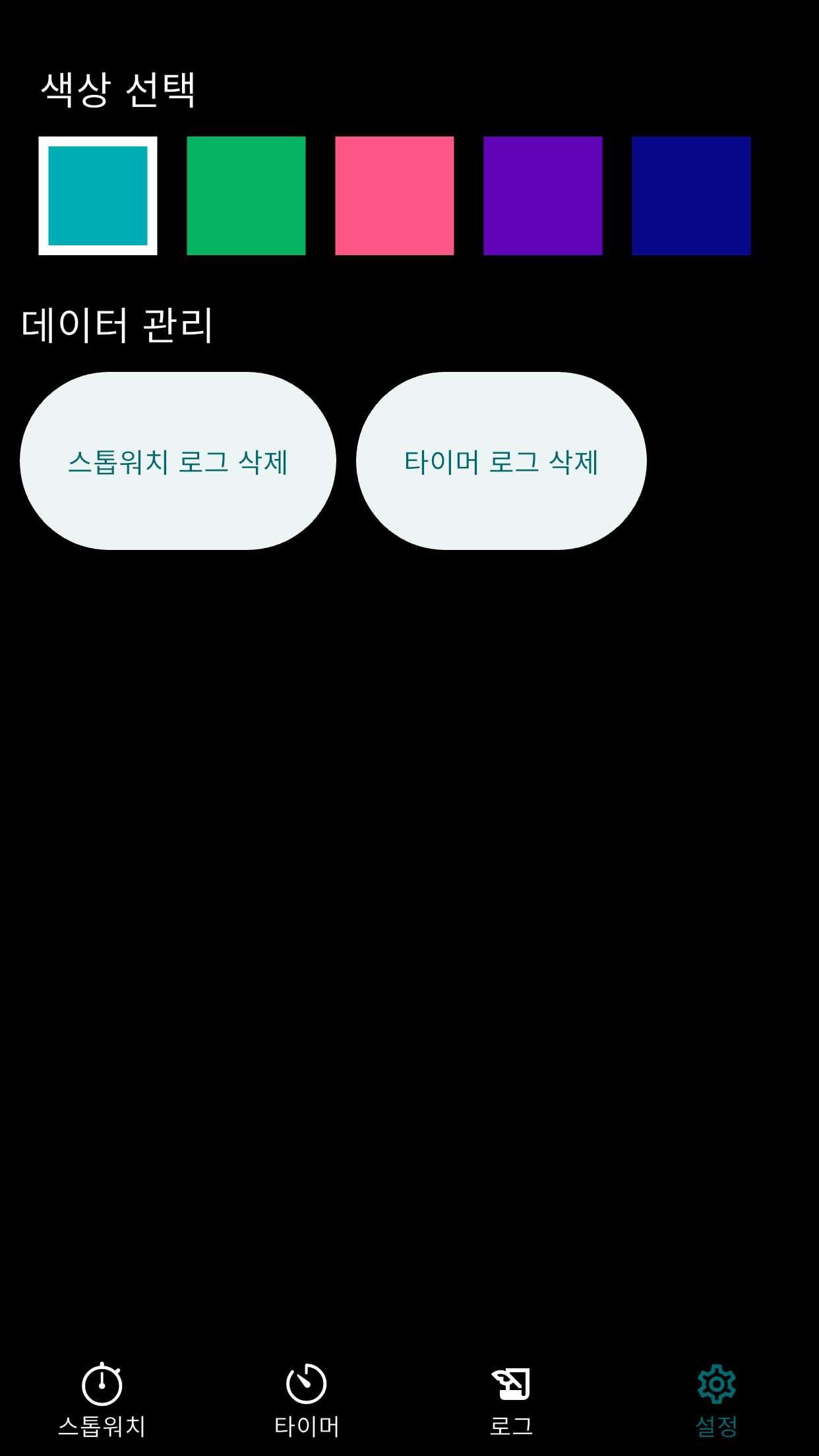 - 설정은 당신의 기호에 맞도록 앱 색상을 지정할 수도 있고, 데이터관리에서 로그 데이터를 삭제할 수도 있습니다.