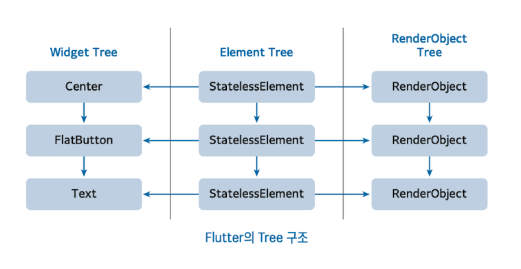 위젯트리와 요소 트리는 일대일 관계를 가지고 있으며, 간단하게는 상태를 분리하여 사용하는 목적으로 분리되어 사용한다고 생각하면 됩니다. 위젯 트리의 위젯객체는 불변이고 빠르게 생성되고 제거될 수 있도록 내부가 구성 되었다. 이러한 위젯과 매칭되는 요소 객체는 상태객체(StateObject)를 가지고 상태의 변경에 따라 요소객체와 매칭된 위젯을 build하여 상태변경을 반역하게 됩니다. 이때 요소트리와 렌더트리는 가능하면 재사용 되도록 설계되어 있습니다.